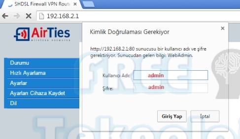 Web tarayıcımızın adres satırına 192.168.2.1 yazarak modem ara yüzüne giriş yapıyoruz. Karşınıza gelen kullanıcı adı ve şifre kısmına “admin”,”admin” yazıyoruz ve giriş butonuna basıyoruz. Şifrenizi kabul etmemesi durumunda modeminizi resetleyerek fabrika ayarlarına alabilirsiniz.
