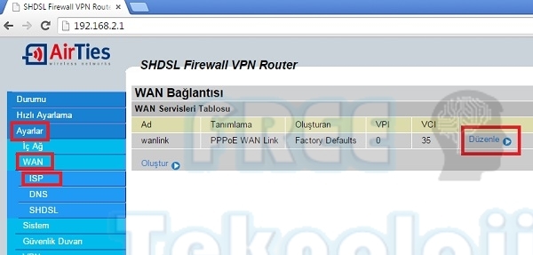 Web arayüzü ekranında, ekranın sol bölümünde bulunan Ayarlar-Wan-ISP sekmelerine tıklıyoruz. Açılan bölümde “Düzenle” bölümüne tıklıyoruz.