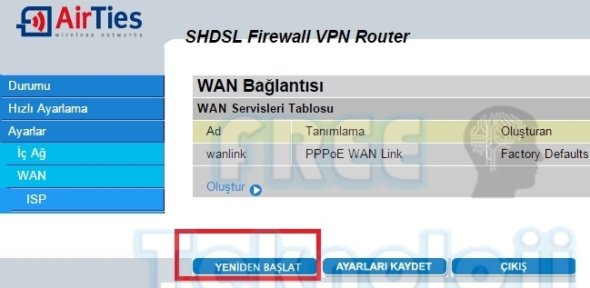 Yaptığımız ayarların modemin Flaşına kaydedilmesi için aşağıdaki “wan bağlantısı” ekranında yeniden başlat butonuna basıyoruz. Bu işlemi atladığımız taktirde ayarlarımız modem ara yüzüne kaydedilememiş olacaktır.