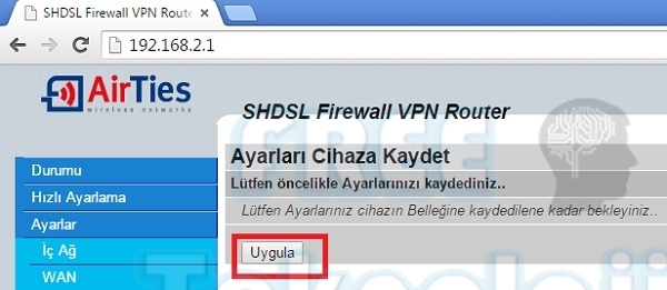 Türk Telekom alt yapı ayarları yapıldıktan sonra yine ekranın sol bölümünde bulunan “Ayarlar-wan-shdsl” sekmesine tıklıyoruz. Aşağıdaki şekilde ayarlarımızı tamamlıyoruz. Uygula butona basıyoruz. Sonrasında en alt bölümde yer alan yeniden başlat a basarak ayarlarımızı kaydediyoruz.
