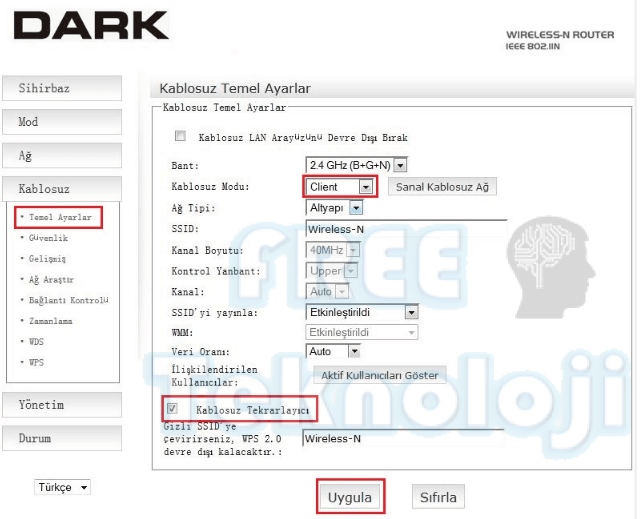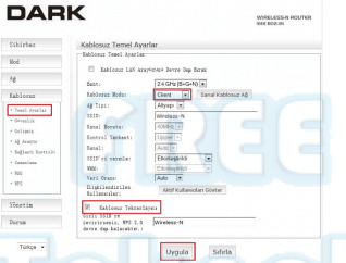 Açılan bölümde sol bölümde yer alan “Kablosuz”-“Temel Ayarlar” sekmelerine tıklıyoruz. Kablosuz modu olarak “Client” seçiyoruz. En alt kısımda yer alan “Kablosuz tekrarlayıcı” seçeneğini işaretleyerek uygula butona basıyoruz.