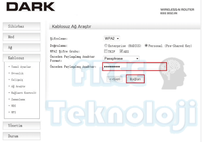 Açılan bölümde Ön paylaşımlı Anahtar bölümüne modemimizin kablosuz ağ şifresini yazıyoruz ve Bağlan butonuna basıyoruz.