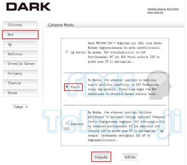 Modemimizin web arayüzünde ekranın sol bölümünde yer alan “Mod” bölümüne tıklıyoruz. Açılan bölümde “Köprü” seçeneğini tıklayarak uygula butonuna basıyoruz.
