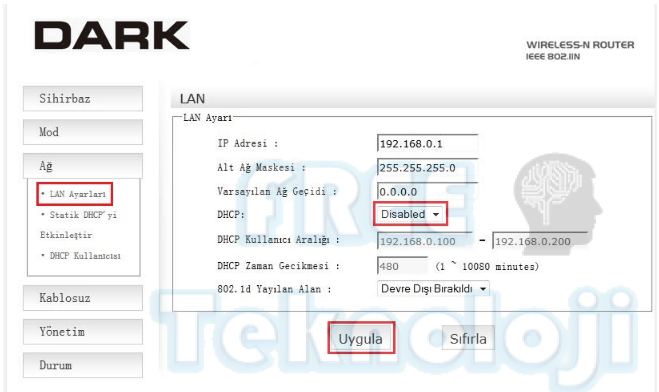 DHCP özelliğini ‘Disabled’ durumuna getirdikten sonra ‘Uygula’ butonuna basarak işlemi tamamlıyoruz.