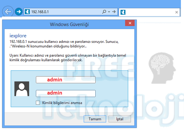 Web tarayıcımızın adres satırına 192.168.0.1 yazarak modem şifre ekranına ulaşıyoruz. Kullanıcı adı ve şifre olarak admin yazarak modem arayüzüne ulaşıyoruz.