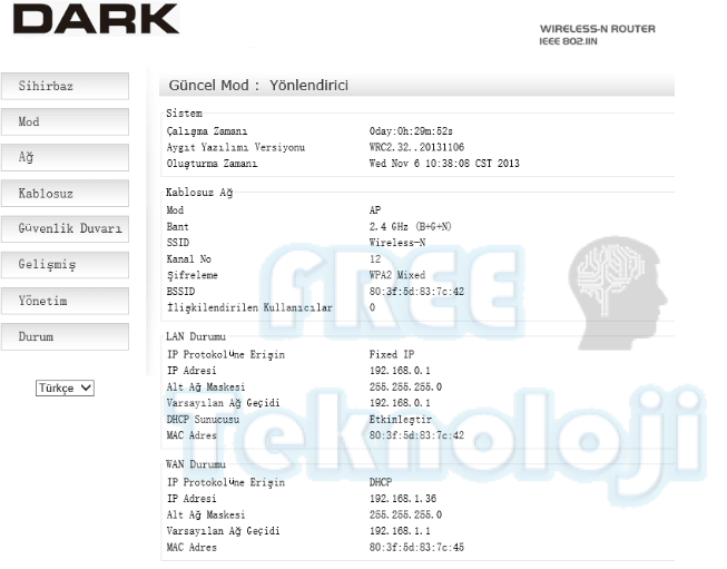 DARK WRT300 Ve DARK WRT320 Router larının web arayüzleri aynı olduğu için kurum adımlarını birlik te göstermeye çalışacağız.