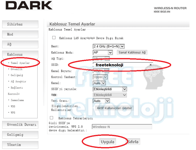 Modemimizin web arayüzünda sol kısımda bulunan “Kablosuz”-“Temel Ayarlar” seçeneklerine tıklıyoruz. Açılan sayfamızda SSID bölümüne Kablosuz ağlarda görmek istediğimiz bir isim belirliyoruz. Biz kablosuz ağ adımızı FREETEKNOLOJİ olarak belirledik. Kablosuz modu olarak “Ap” seçerek Uygula butonuna basıyoruz.