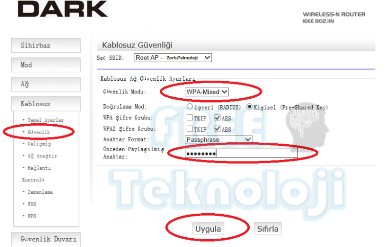 Kablosuz ağımıza bir isim verdikten sonra gelelim kablosuz ağımıza şifre koymaya. Yine ekranına sol bölümünde yer alan “Kablosuz”-“Güvenlik” seçeneğine tıklıyoruz. Güvenlik modu olarak “Wpa-Mixed”seçiyoruz. Anahtar Formatı olarak Passphrase seçtikten sonra Ön Paylaşımlı Anahtar bölümüne en az 8 haneli bir kablosuz şifre belirliyoruz. Ve uygula butonuna basarak ayarlarımızı kaydediyoruz.