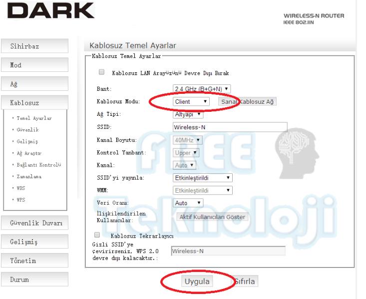 Sonrasında yine sol bölümde yer alan “Kablosuz” -“Temel Ayarlar” sekmesine tıklıyoruz. Kablosuz modu olarak “Client” seçeneğini seçerek uygula butonuna basıyoruz.