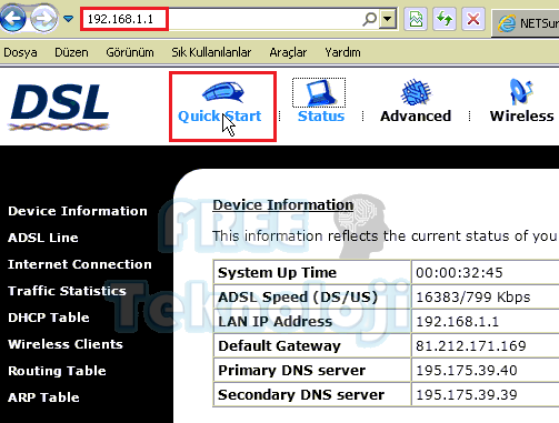 Şifre adımlarını geçmenizin ardından modem arayüz ekranı açılacaktır.Bu ekranda “QUİCK START” butonuna basınız.