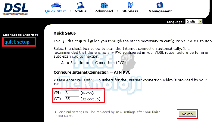 Daha sonra ekranın sol bölümde yer alan quick setup bölümüne tıklayınız. Karşınıza gelecek olarak ayarlar ekranında Vpı:8 Vcı:35 seçerek Next butonuna basınız.