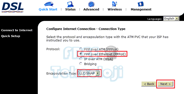 Yeni sayfamızda protocol olarak PPP over Ethernet (PPPOE) Encapsulation Type LLC seçerek Next butonuna basınız.