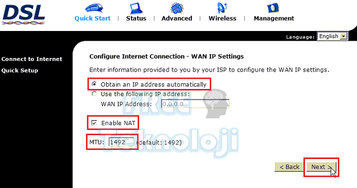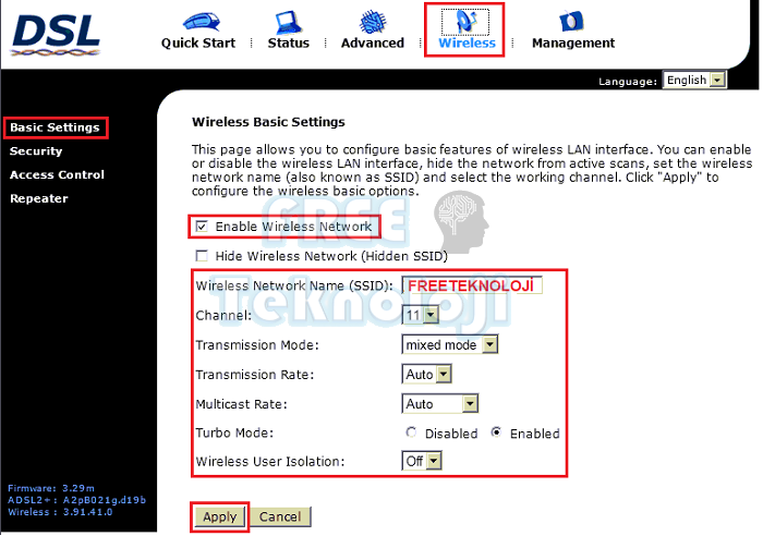 Modeminizin kablolu ayarlarını yapılandırnız. Modeminizin kablosuz ayarları için ekranın sol üst bölümünde yer alan Wireless butonuna tıklayınız.Açılan bölümde Basic Settings sekmesine tıklayınız.Karşınıza gelen ekranda Enable Wireless Network kutucuğunu işaretleyiniz. Bu kutucuğu işaretlemez iseniz kablosuz ağınız aktif olmayacaktır. SSID alınana kablosuz ağlarda görmek istediğiniz ağ adını yazınız. Biz FREE TEKNOLOJİ olarak belirledik.Sizde istediğiniz bir ismi ağ adı olarak belirleyebilirsiniz. Apply butonuna basarak ayarları kaydediniz.