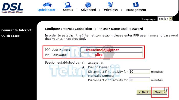 Bu ekranımızda modeminize servis sağlayıcınız tarafından verilen kullanıcı adı ve şifre bilgilerini girmeniz gerekmektedir. Kullanıcı adı ve şifre bilgilerini bilmiyor iseniz servis sağlayıcınızı arayarak öğrenebilirsiniz. Servis sağlayıcınıza ait çağrı merkezi numarasına buradan ulaşabilirsiniz. Kullanıcı adınızın sonunda servis sağlayıcılara göre değişkenlik gösteren @domain adını yazmayı unutmayınız. Tüm Servis sağlayıcılara ait domain adına BURADAN ulaşabilirsiniz.