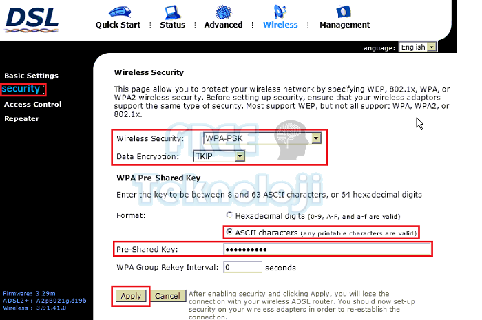 Kablosuz modeminizin güvenlik ayarı için ekranın sol bölümünde yer alan Securtiy sekmesine tıklayınız. Wireless Security bölümünde WPA-PSK seçiniz. Orta kısımda bulunan işaretlemeleri yaparak Pre-Shared Key bölümünde en az 8 haneli bir kablosuz ağ şifresi belirleyiniz.Son olarak Apply butonuna basınız.