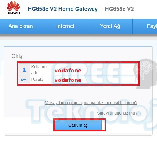 Kullanıcı adı: admin yada vodafone