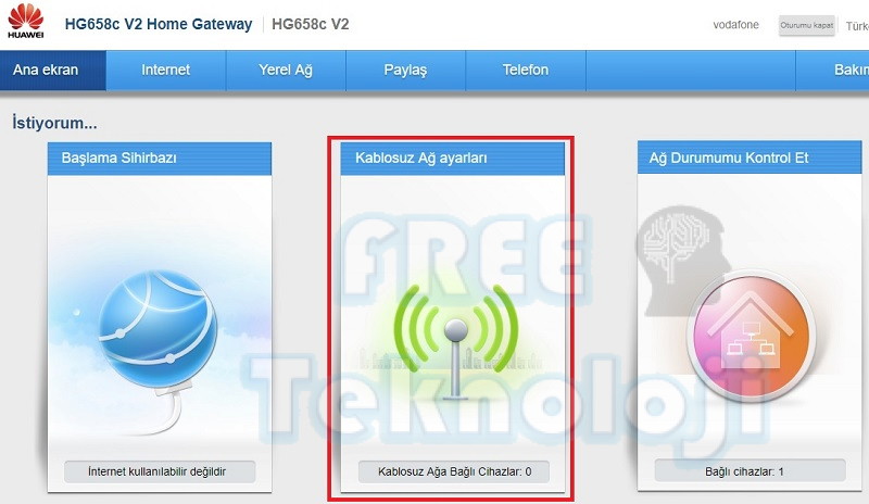 Açılan modem arayüz ekranında modeminizin kablosuz ayarları için orta kısımda yer alan “Kablosuz Ağ Ayarları” bölümüne tıklayabileceğiniz gibi;