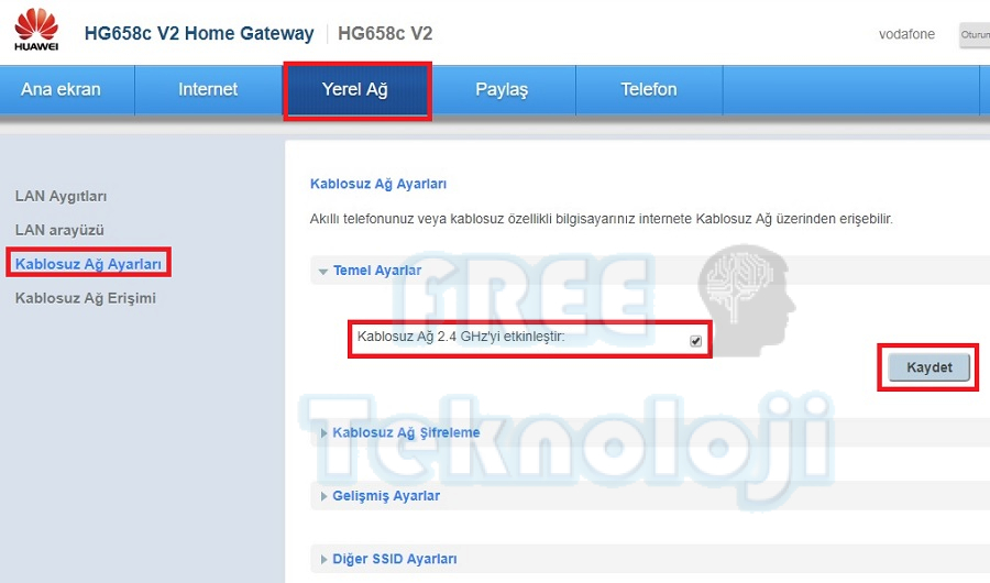 Açılan ekran da “Kablosuz Ağ 2,4 Ghz’yi etkinleştir” seçeneğini işaretleyerek kaydet butonuna basınız.