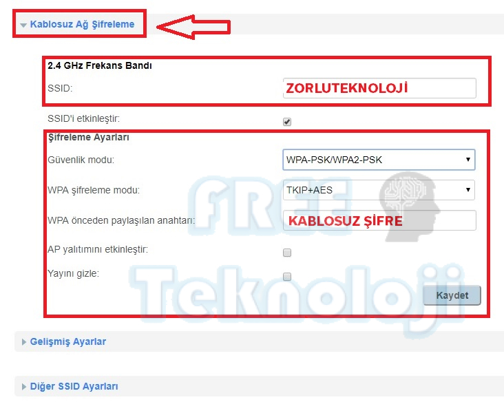 Güvenlik modu bölümünde wpa-psk/wpa2-psk seçeneğini seçiniz.Şifreleme modu olarak Tkıp+Aes seçeneğini seçiniz. Wpa önceden paylaşılan anahtar kısmında kablosuz ağınız için en az 8 haneli bir kablosuz ağ şifresi belirleyiniz.