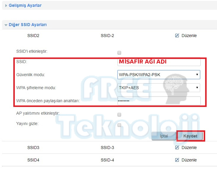 Açılan ekranda misafir ağınız için oluşturacağınız bir ağ adı ve şifre belirleyerek kaydet butonuna basınız.