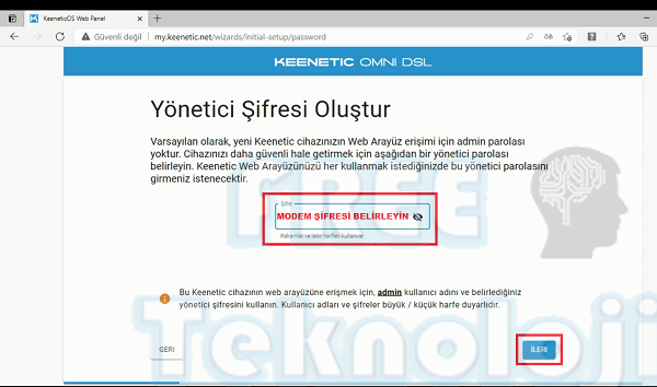 Yeni açılan ekranda modem ara yüzünüz için bir yönetici şifresi belirleyiniz ve ileri butonuna basınız.