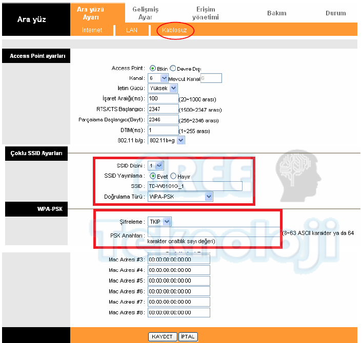 Burada SSID bölümüne kablosuz ağlarda görmek istediğiniz kablosuz ağ adını yazınız. Doğrulama Türü olarak “WPA-PSK” Şifreleme: ”TKIP ” seçiniz. Psk Anahtarı bölümünde Kablosuz ağda kullanacağımız en az 8 haneli bir kablosuz ağ şifresi belirleyerek ayarlarınızı kaydediniz.
