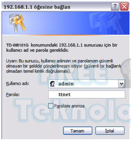 Web tarayıcınızın adres satırına 192.168.1.1 yazarak enter butonuna basınız. Açılan kullanıcı adı ve şifre ekranında;