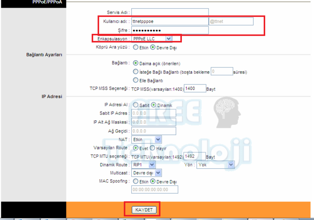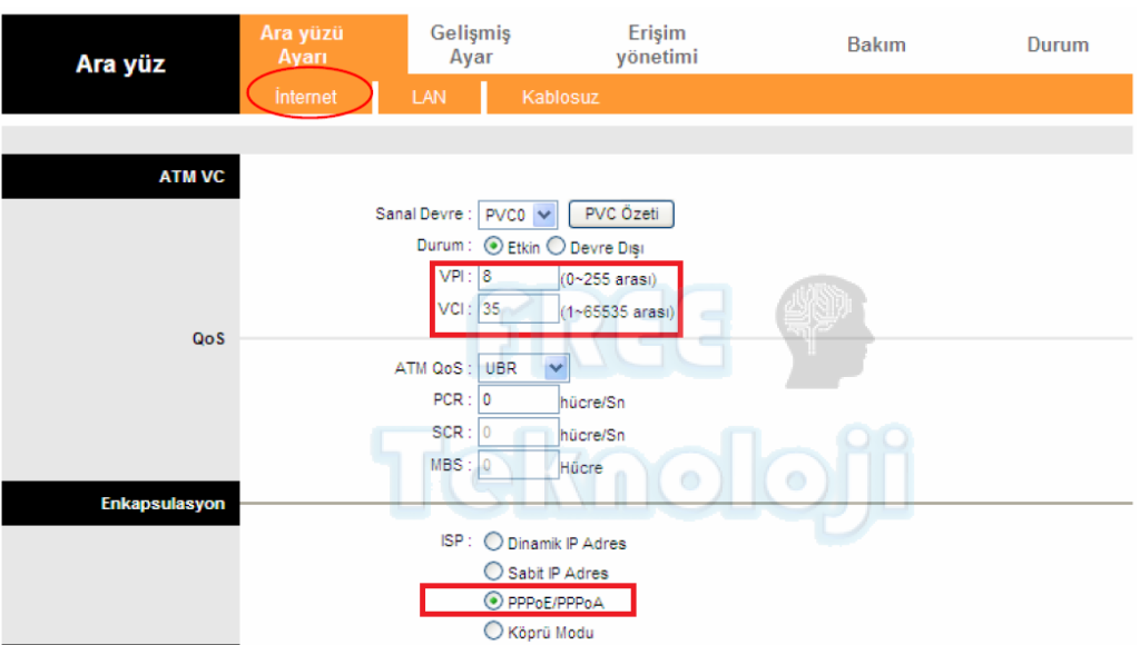 Açılan modem arayüz ekranımızda “Arayüzü Ayarı” -“İnternet” seçeneklerine tıklayınız. Bu ekranda standart alt yapı değerlerimiz olan vpı:8 vcı:35 PPPoE/PPPoA seçiniz. Kullanıcı adı ve şifre alanında kullanıcı adı şifre olarak servis sağlayıcınızın size vermiş olduğu kullanıcı adı ve şifreyi yazınız. Kullanıcı adınızın sonunda servis sağlayıcılara göre değişkenlik gösteren @domain adını yazmayı unutmayınız.
