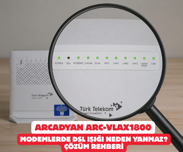 Arcadyan, ARC-VLAX1800, DSL ışığı yanmıyor, internet yok, modem sinyal sorunu, splitter arızası, Türk Telekom modem arıza, DSL kablosu kontrolü, modem resetleme, sinyal yok hatası, altyapı sorunu, RJ11 kablo, modem kurulumu, internet ışığı yanmıyor, teknik destek.