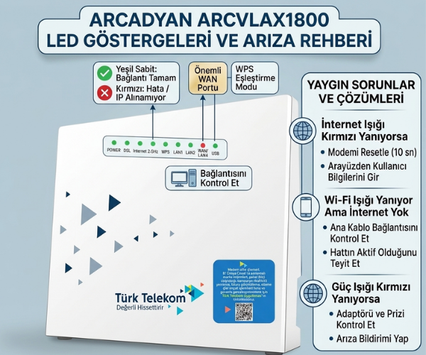 Arcadyan ARCVLAX1800, Türk Telekom modem kurulumu, modem LED göstergeleri, internet arıza giderme, Wi-Fi 6 modem ayarları, ARCVLAX1800 resetleme, modem ışık renkleri anlamı, geniş bant hatası çözümü, WAN ışığı yanmıyor, modem kullanıcı adı şifre değiştirme, Arcadyan teknik özellikler, fiber internet kurulumu, modem donanım hatası, 5GHz Wi-Fi ayarı, modem arayüzüne giriş, sinyal kopma sorunu çözümü.
