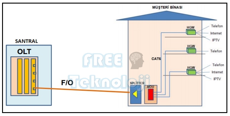 Bağlantı şekli diğer bakır alt yapılarda olduğu gibidir. Daire iç tesisatında bakır tesisat var ise yukarıdaki şemaya uygun bağlantı yapabilirsiniz. Daire içerisinde ethernet bağlantısı (cat5, cat6) var ise aşağıdaki 2. yöntem bağlantıya uygun olarak bağlantılarınızı yapılandırabilirsiniz.